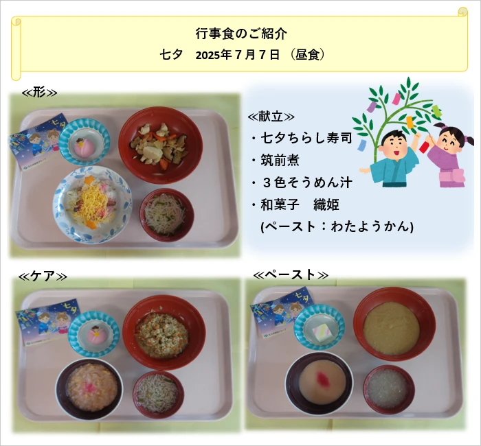 今回は3色のそうめんを使用し華やかに仕上げ、ちらし寿司や織姫の形の和菓子で七夕を演出しました。